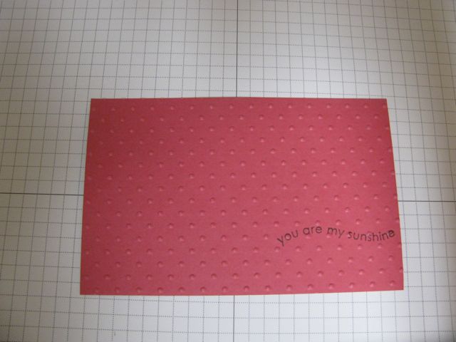 Step 2: Stamp the greeting in Early Espresso Ink on the Melon Mambo card stock and run it through the Big Shot in the Perfect Polka Dots Impressions Folder.
