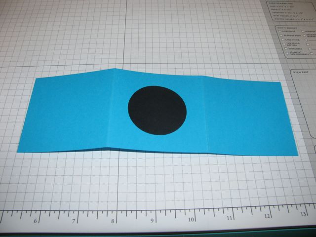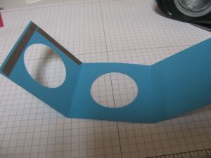 Step 3: Fold the Turquoise card stock and punch a hole with the 1 3/4″ Circle Punch in the center square and one side (HINT: glue a punched circle from a different color in the center to ensure perfect