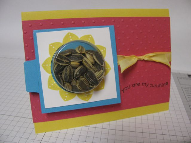 You can just pull the cover out the left side to get to the sunflowers (or any other treat you fill it with). I promised my Stamp Club members that I would share the dimensions and instructions for this card, and I’m finally making good on the promise! The dimensions/colors are given for this particular card, but go ahead and get crazy using your own colors 🙂