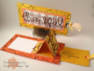 You could fill these boxes with treats, but I chose to make a Gratitude album. Open it up and pull out the pages to add photos of who or what you are thankful for, and journal why they matter to you. You can add at least TWO strips of 3.25″ x 12″ card stock (scored every 2.5″) end-to-end to make long accordion pages, though this is just one strip: