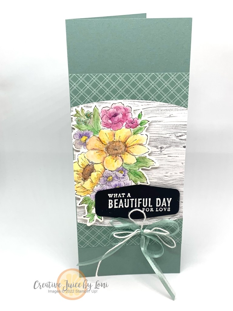 The first card I demonstrated was the elegant “gate-fold” card, which opens to reveal a simple branch of mouth-watering fruit. For once in my career, I DIDN’T add a sentiment to this card! It seems like it could be used for any reason, so I left the options open.