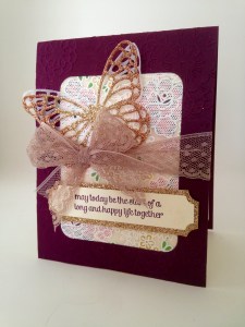 This is one of our acetate card boxes that you could decorate and fill with a small gift like tea towels, napkins, cash or thank you cards for a newlywed couple. While the mercury glass acetate sheets in this suite are colored Rococo Rose or Highland Heather on one side, they are silver on the back side, as used on this sample.