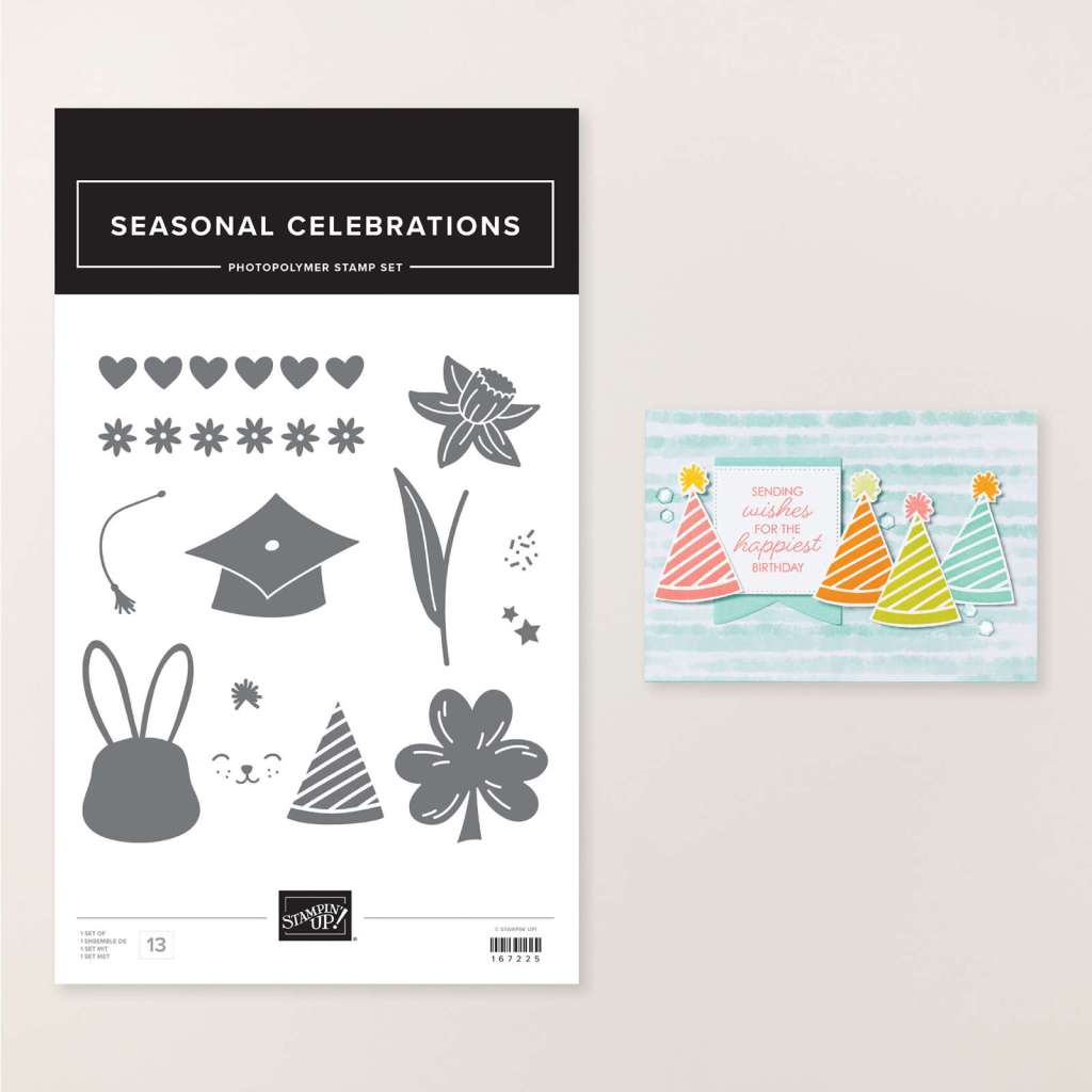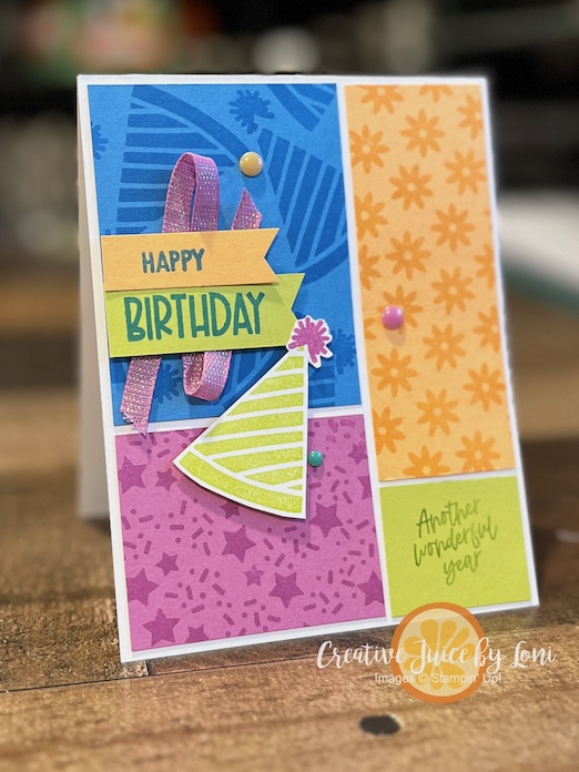 This bright, happy card was created by pairing the Reason to Celebrate stamp set from the new January–April Mini Catalog with Seasonal Celebrations from the January Online Exclusives, which serendipitously pair together perfectly (certainly it was good planning on the part of Stampin’ Up!®️). The bold greeting anchors the card with confidence, while the playful stamped party elements on blocks of color bring in movement, color, and a sense of joy. Together, they strike that sweet balance between cheerful and heartfelt, which is exactly what birthday cards should feel like.